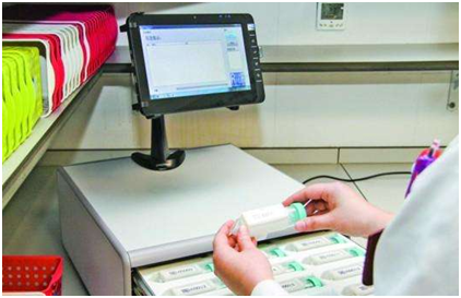 護士通過指紋驗證打開智能藥柜,根據(jù)系統(tǒng)指示取出分裝好的藥,直接對應(yīng)發(fā)給每一位病人。